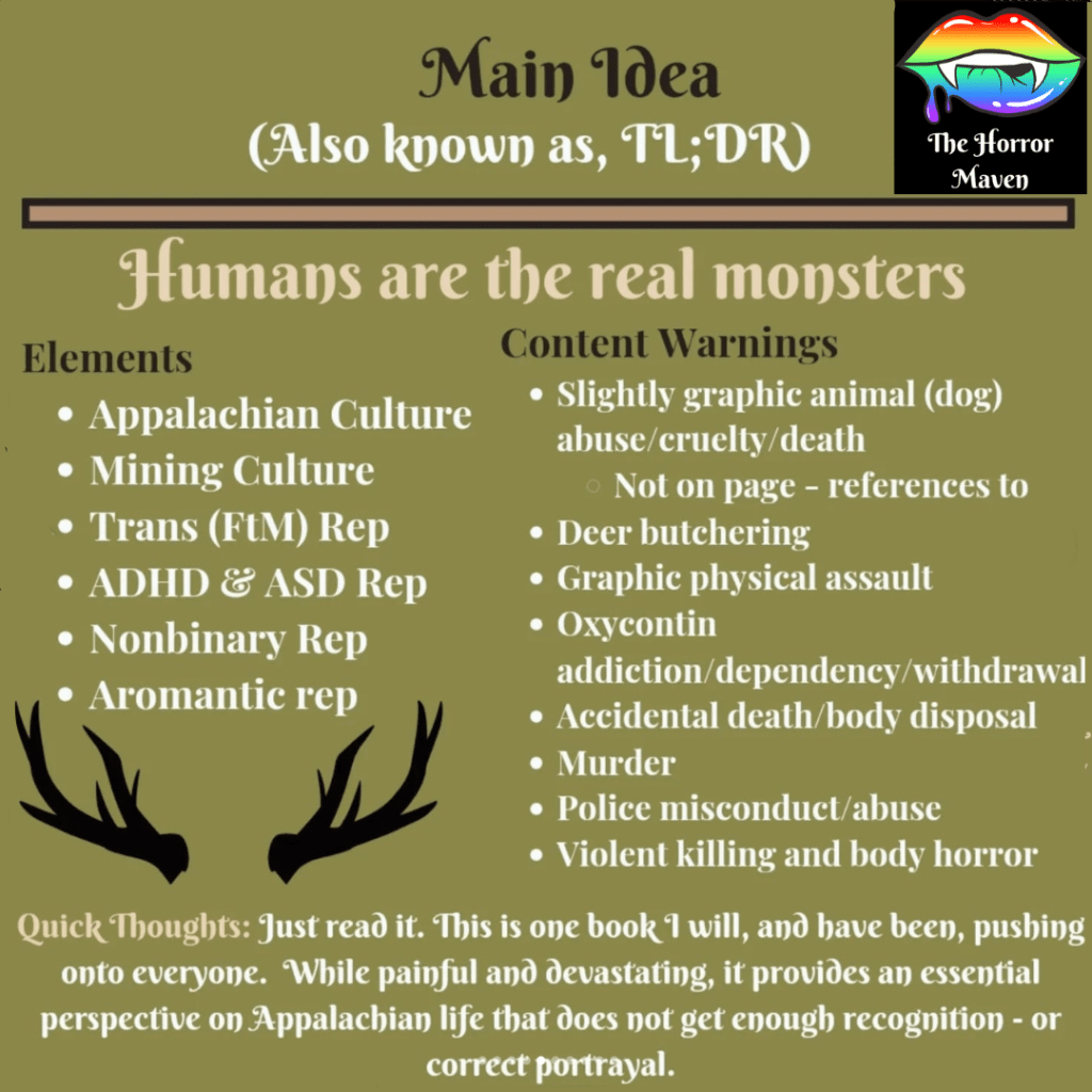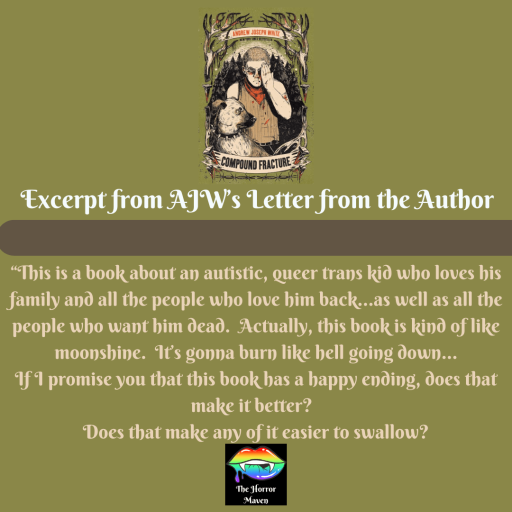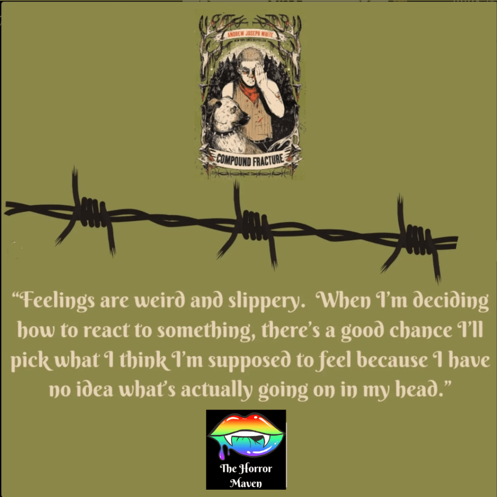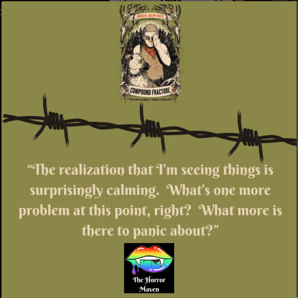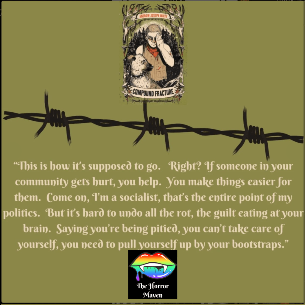 Compound Fracture is bloody, gritty, and horrific in every sense of the word. But the scares here aren’t classic. While there is a paranormal aspect, it is about how the worst monsters are human, and those who SHOULD protect us are so often violent beyond measure. The book is set in White’s native West Virginia, and sheds light on Appalachian and mining culture, oxycontin addiction, lack of proper healthcare, police brutality, generational trauma, and the dangers of being queer and/or having a disability, or in any way being “othered,” in these rural areas.